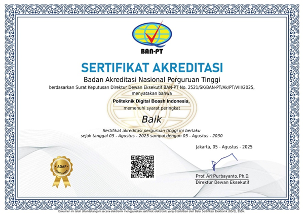 Pada Periode ini, Politeknik digital Boash Indonesia telah mendapatkan status akreditasinya sebagai “BAIK” berdasarkan Surat Keputusan Direktur Dewan Eksekutif BAN-PT No. 2521/SK/BAN-PT/Ak/PT/VIII/2025