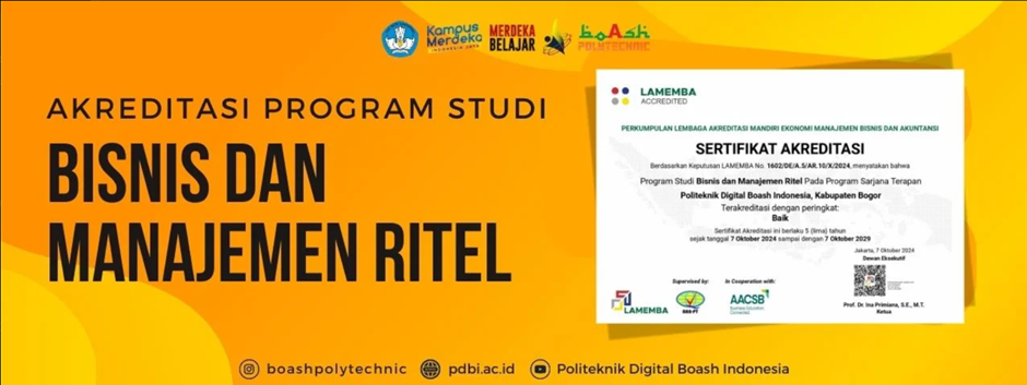 Berdasarkan Surat Keputusan LAMEMBA No.1602/DE/A.5/AR.10/X/2024. Program studi Bisnis dan Manajemen Ritel telah mendapat predikat akreditasi “BAIK”, hal ini menandakan bahwa program Studi ini siap dalam segala aspek untuk menciptakan lulusan yang akan terjun ke dunia kerja.